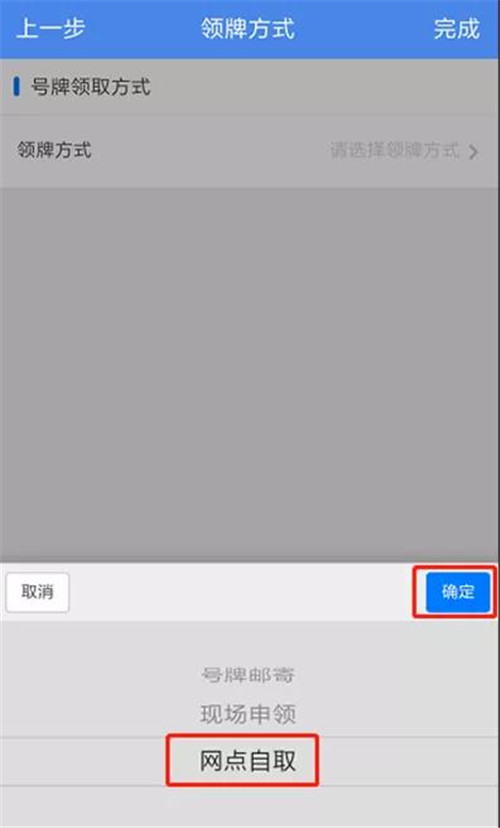 步驟六:點擊【領牌方式】,選擇“網點自取”方式,點擊【確定】,點擊【領牌網點】,選擇相應的網點后點擊【確定】