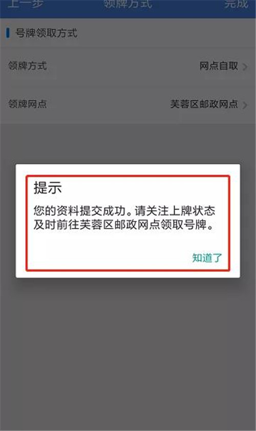 步驟七:確定“領牌方式”與“領取網點”無誤,點擊【完成】,即可完成業務申請