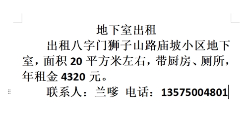 出租八字門獅子山路廟坡小區地下室,面積20平方米左右,帶廚房、廁所,年租金4320元。