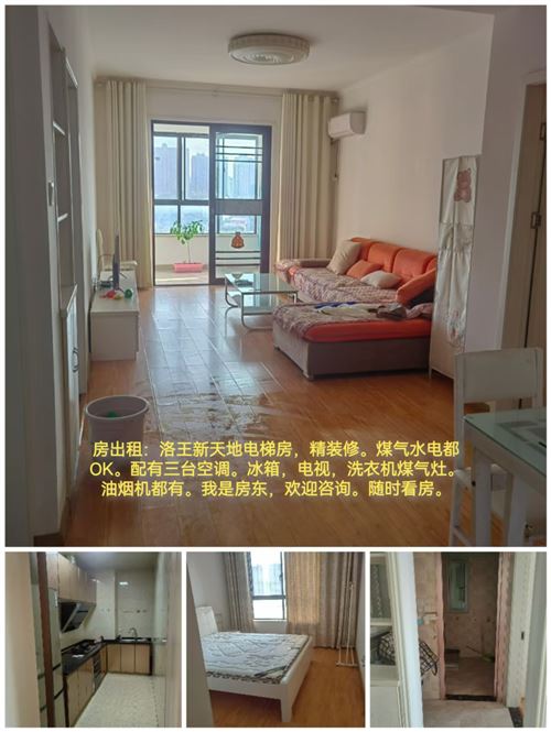 洛王新天地。樓下購物方便,交通也方便。負1樓。樓下廣場都好停車。2房2廳。客廳兩個臥室都有空調。熱水器,電視機,冰箱都有。隨時看房。我是房東。歡迎長租聯系。17716716257